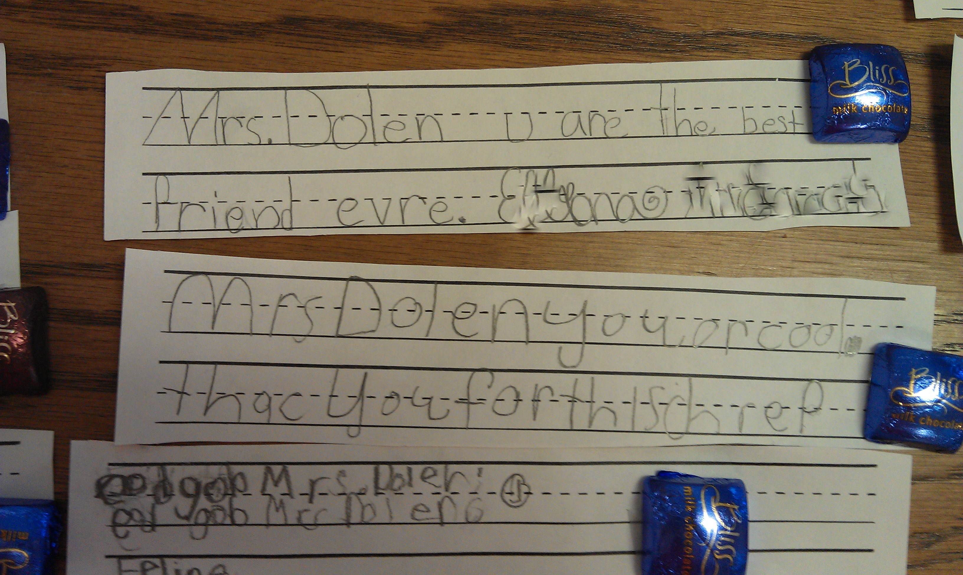 Then the cards and notes began to roll in, one by one. The teachers obviously had a routine down, because the kiddos took turns bringing their handmade cards and notes to FS, each one with a mini chocolate of some sort. It was a-dor-able. Here is a smattering of our favs:
