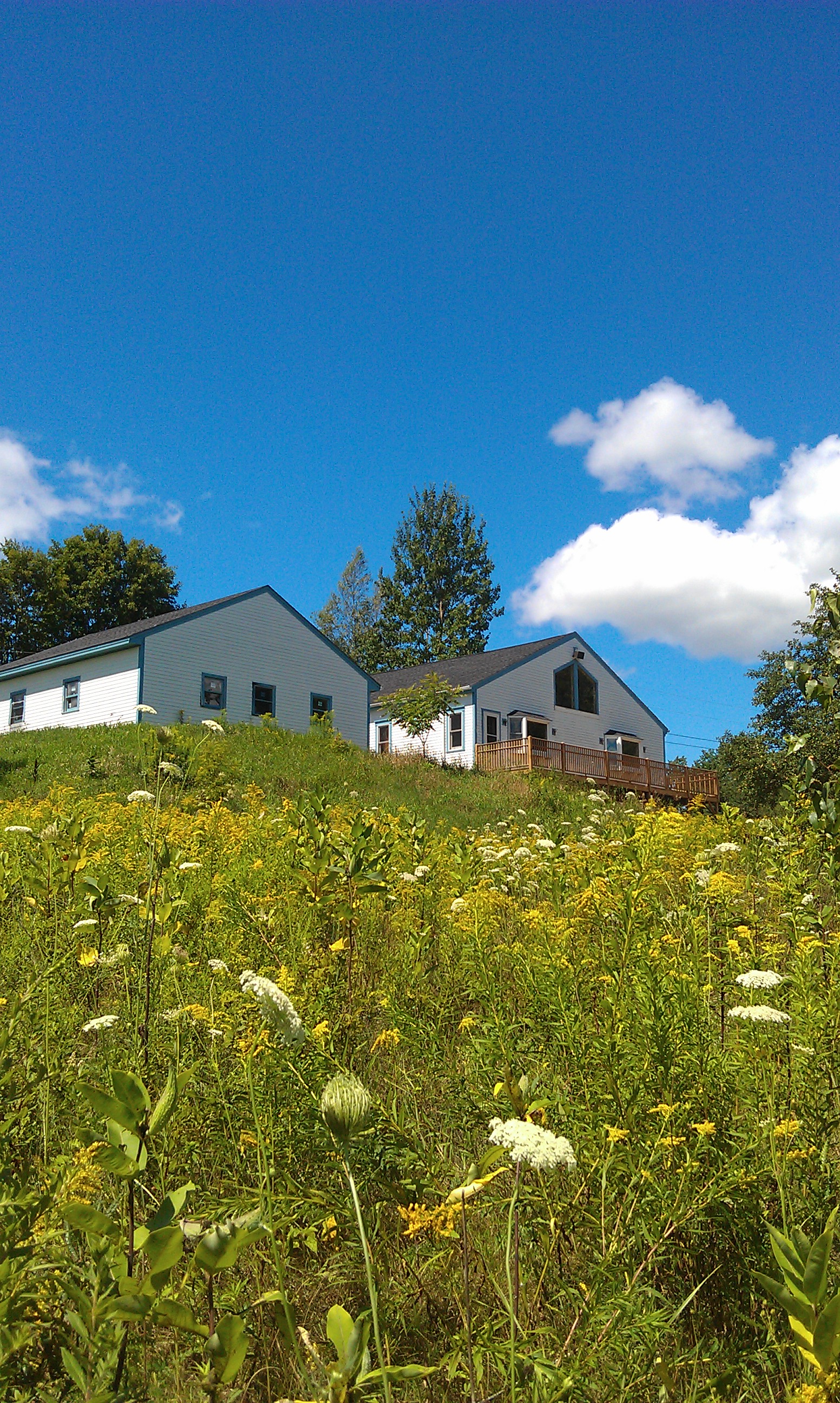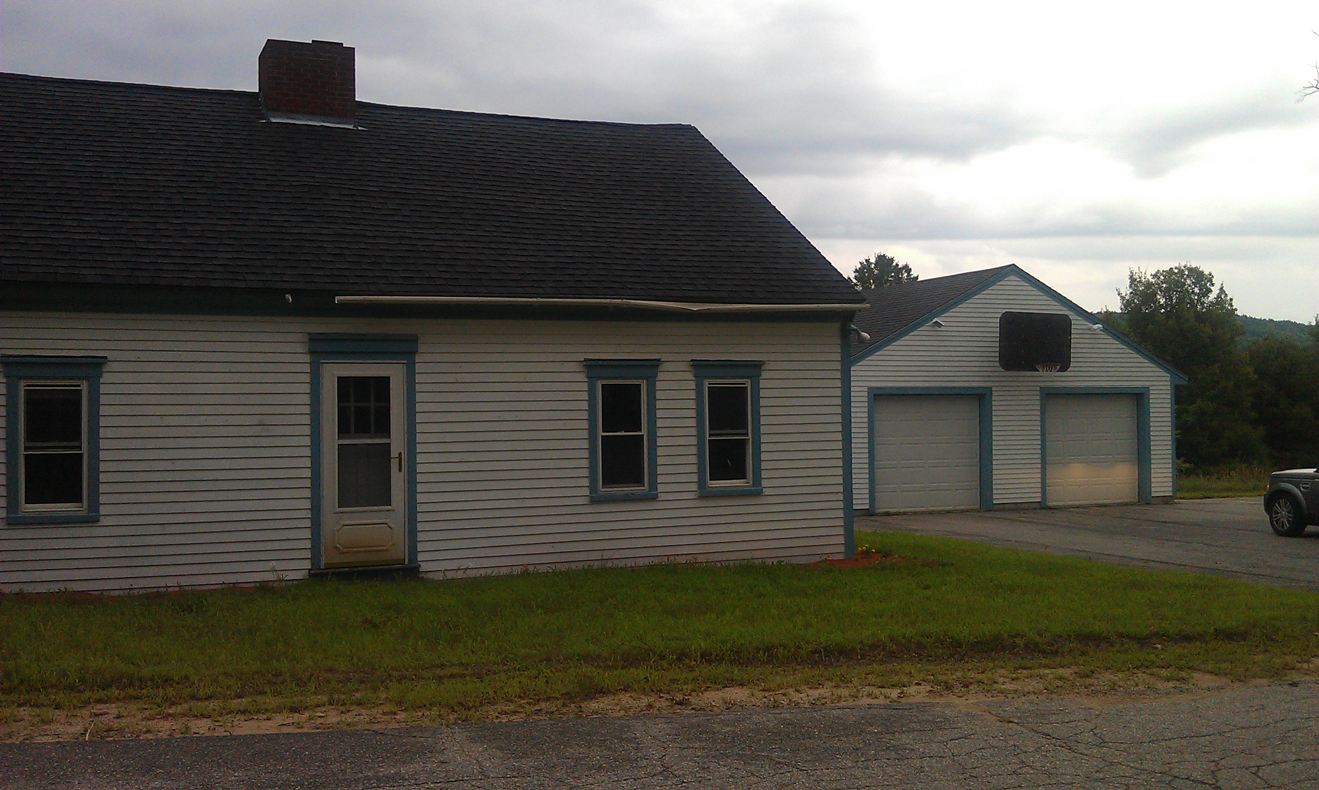 The house from the road. Pretty unassuming, but not for too much longer. We're thinking twirly slide off the chimney?