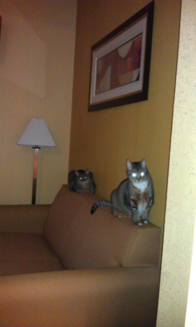 The cats were their own kind of challenge. In the hotel, Darwin hid in the nasty crack between the bed and the wall and only came out when coaxed. He would then immediately jump on my lap in the bed and drag up all sorts of yuck from the hotel netherworld. Apple complained off and on for the whole trip.
