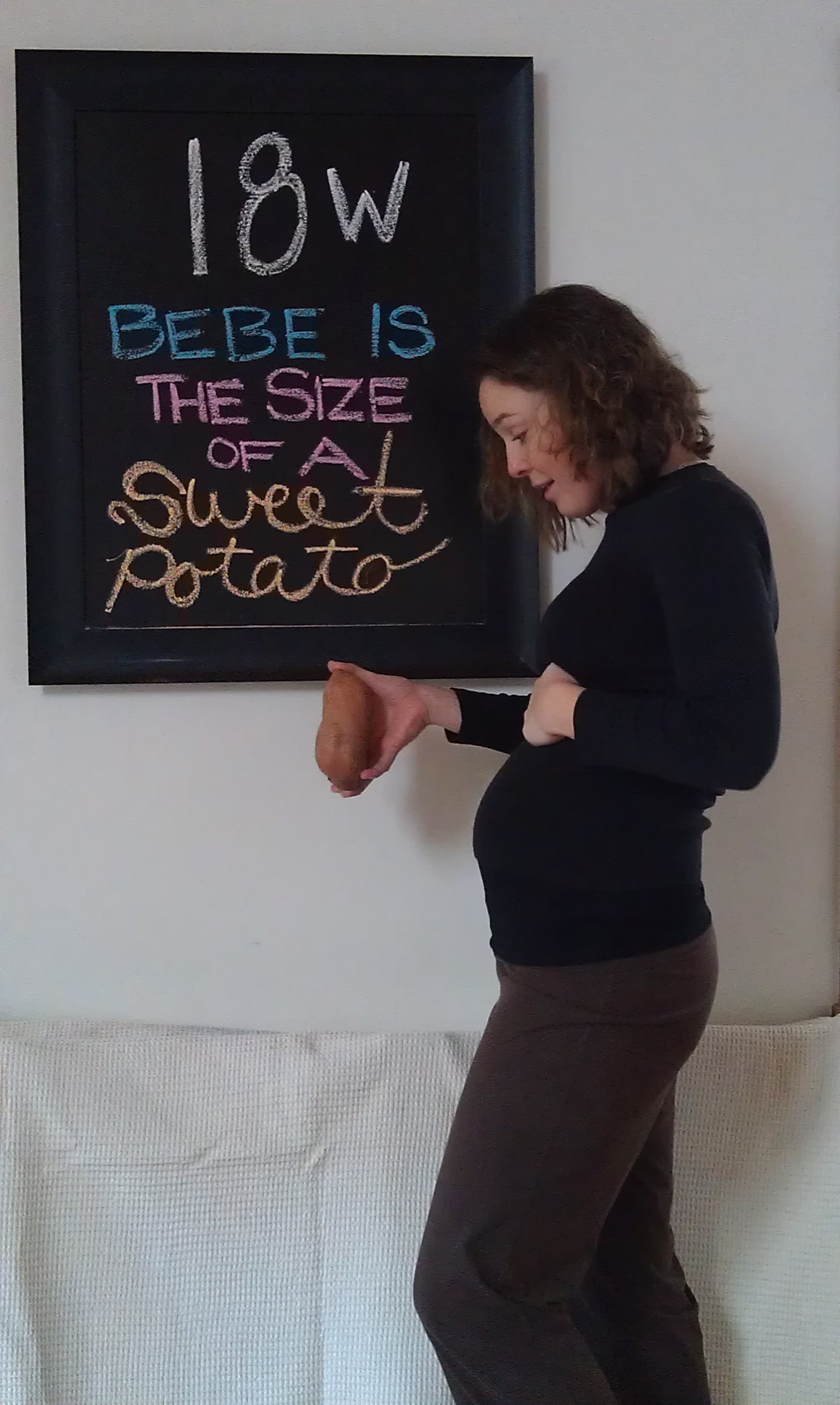 So now I have a sweet potato kicking around in there. Actually, as I type this, I can feel him/her getting more comfortable. I felt the first little kicks on the 30th of Dec- there was just one or two while lying in bed trying to fall asleep. I wasn’t positive that’s what I was feeling until almost a week later. I was driving back up from Manchester at 6am (taking the nieces to the airport before my first day at my new job). I had a long day ahead of me and stopped for coffee. About 20min into my cup, I felt kicks. Lots of kicks.