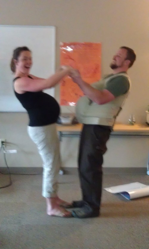 On Saturday, Luke and I had our childbirth class. It was mostly useless, but we learned some stuff (maybe we should have stuck with an infant care class?). The best part was the empathy belly. Luke was a great sport: