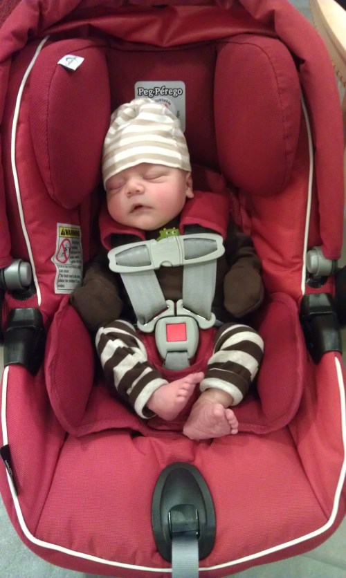 Headed home! This outfit lasted partway through the 45 minute drive until an epic poop-splosion paired with a spit-up fest forced us to change tack. Ahh well.