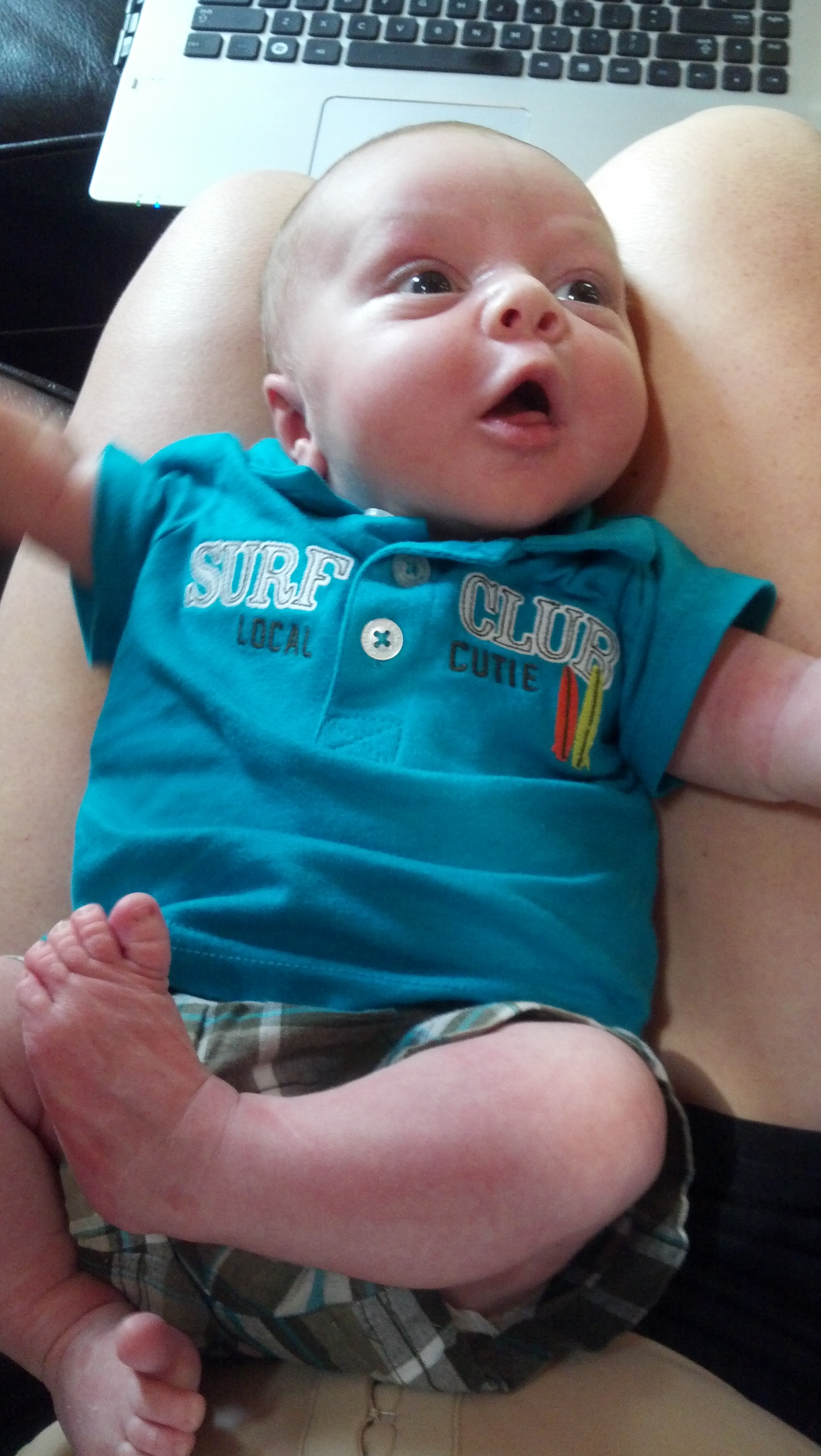 Grey’s currently in Baby Jail again, sleeping soundly. He had his 2 week appointment on Tuesday and had gained another 3 oz. So he’s up to 9lbs 10oz, and 21 1/2 inches long. He got a beautifully clean bill of health, and is currently in the 77th percentile for size. I’m very happy with that number! His umbilical cord fell off yesterday as well.