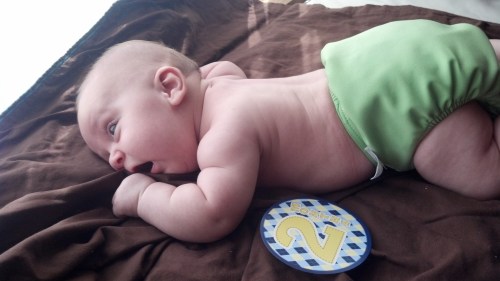 He still wears most of his 0-3month clothes, but we cloth diaper about 75% of the time, and that makes some of them too tight. Worth it though, we’ve already saved a ton of cash, and his little bum has been rash free since we started a few weeks ago. =)