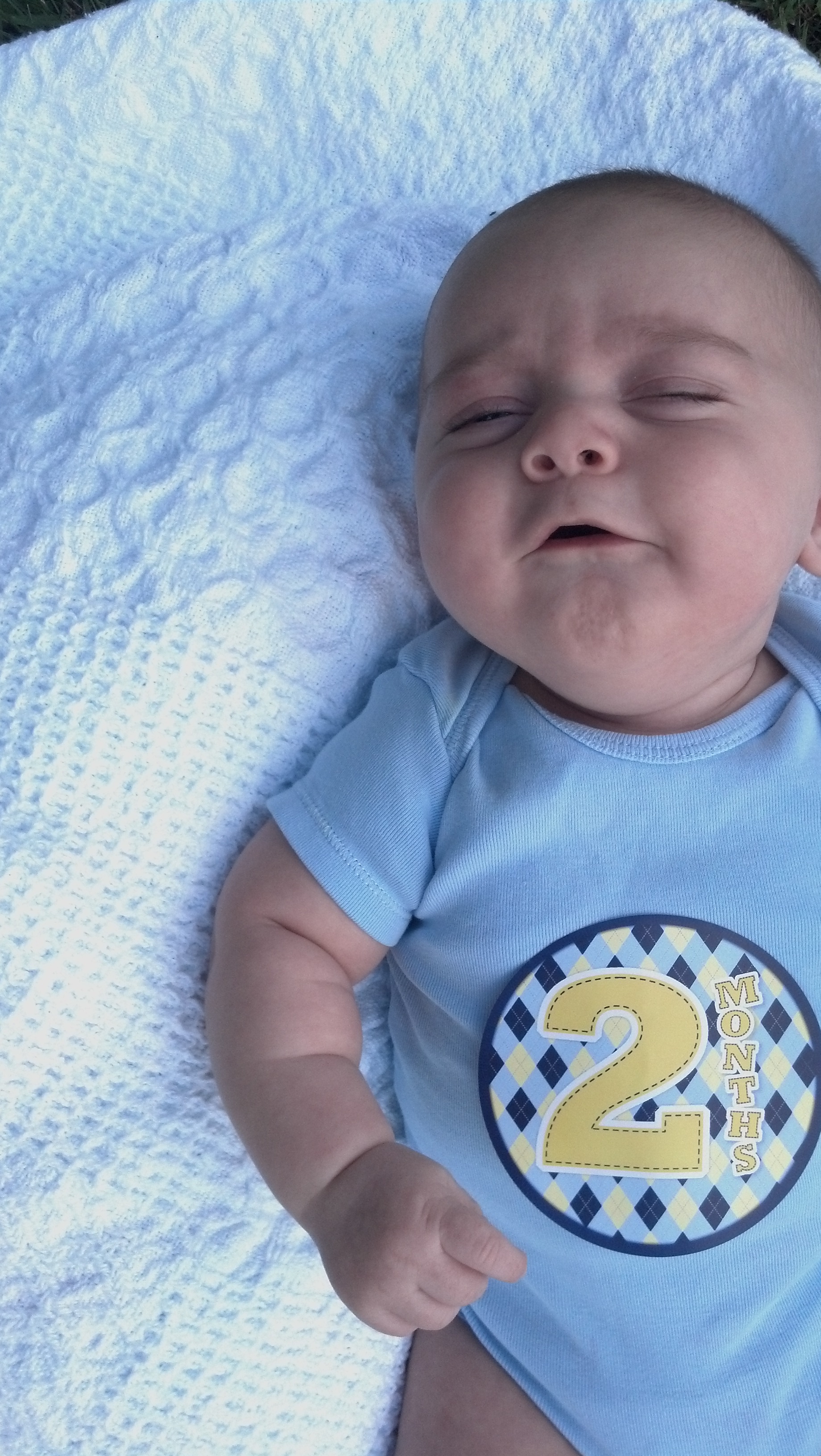 I took Grey to his 2 month visit over a week ago and haven’t posted the numbers! Grey weighed in at a whopping 14lbs, 12oz (97th percentile!) and is 23.5 inches long. His length and head circumference is in the 75th percentile. What does this mean? It means what we already know- we’ve got ourselves a chunk! Ok- on to the pictures!