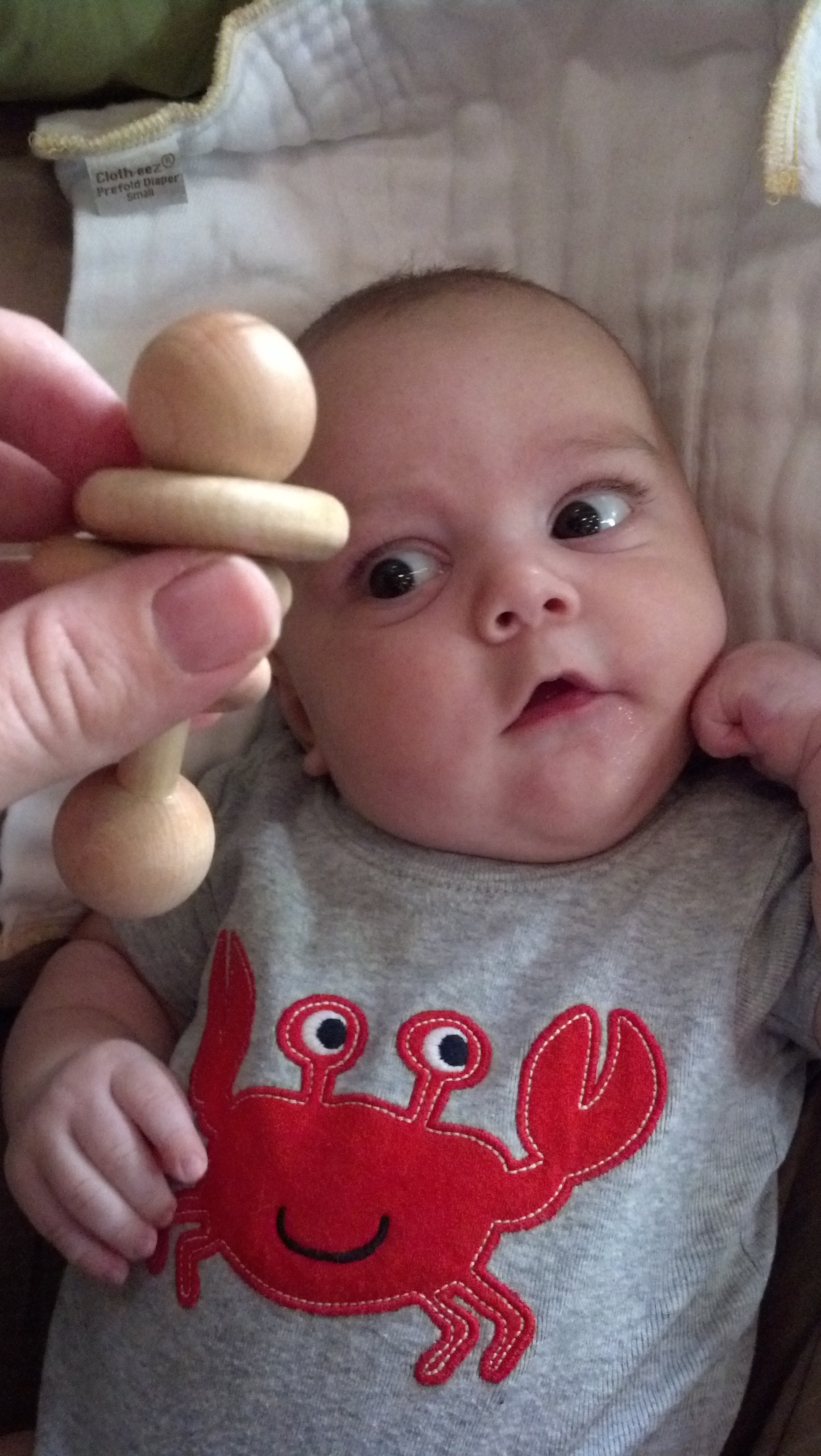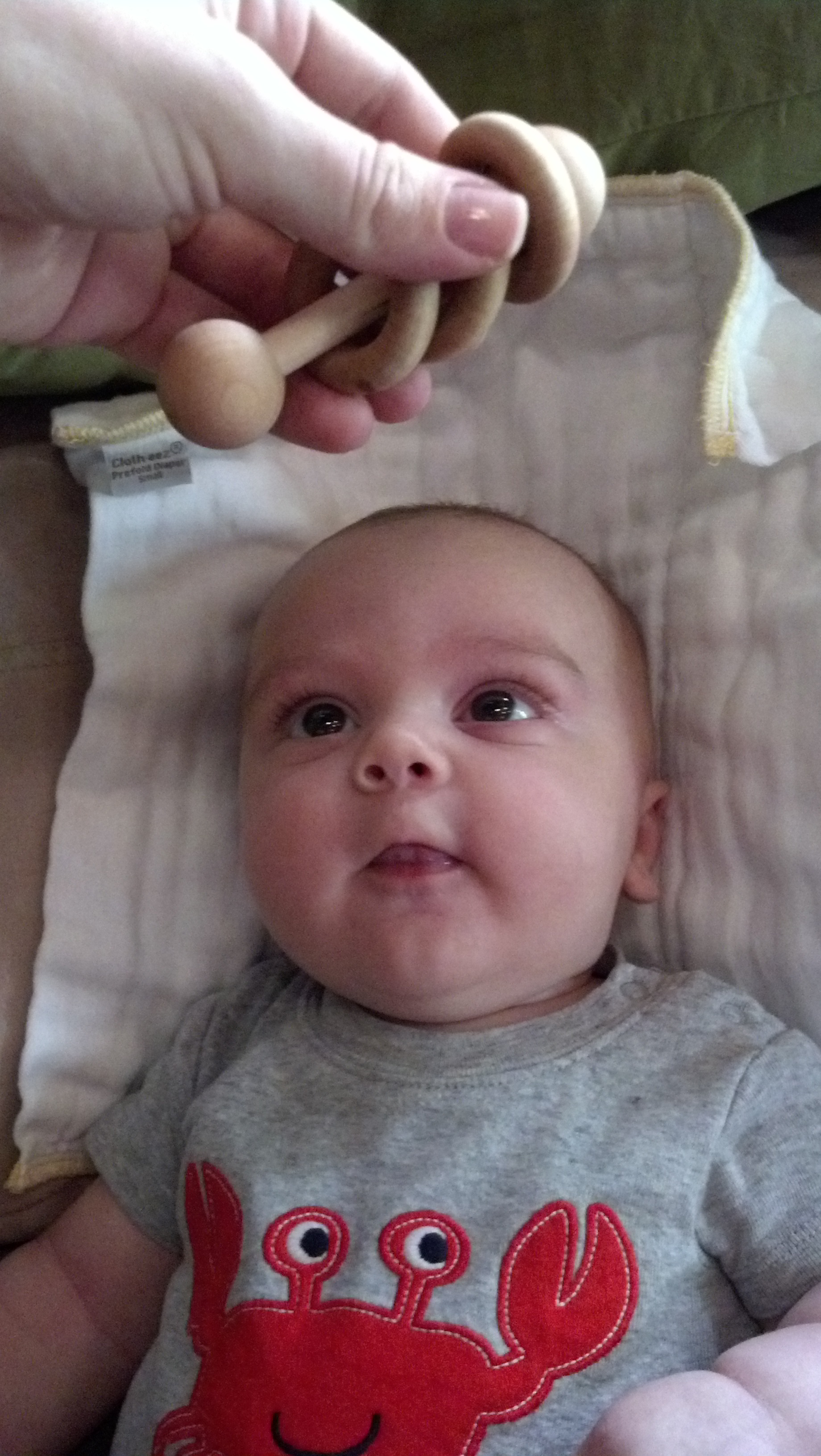 We got a really cool teether from Laura- he’s pondering… “What the heck am I supposed to do with that?!”