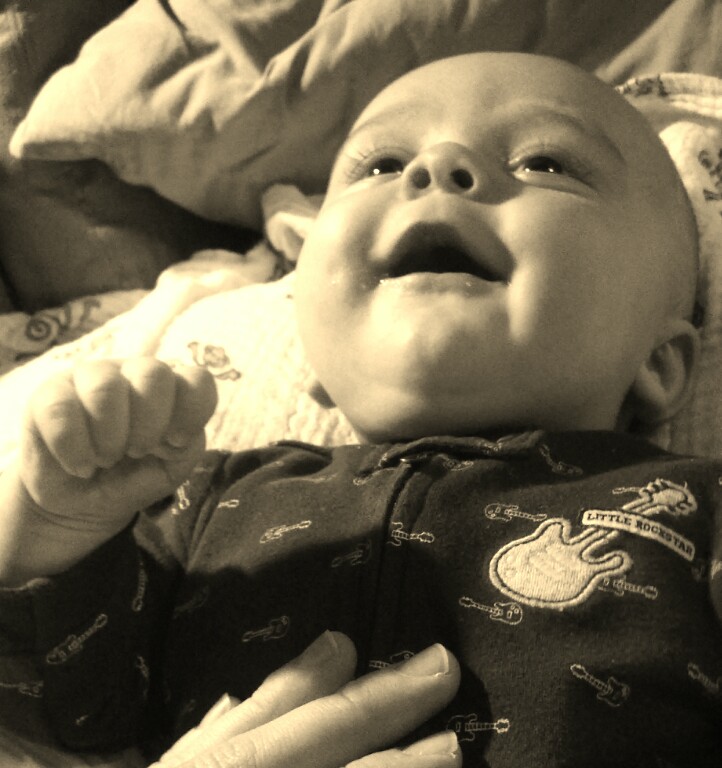Grey talks, squeals and howls, shout, and laughs! Last night he let out his first real Ha! Ha! laugh last night! It was after a bath, and he was in my arms watching Luke like a hawk. As soon as Luke noticed and began to talk to him, Grey was all smiles, laughing, talking to him, and swinging those fat little arms at him! It was possibly the cutest thing we’ve ever seen. He went on for a good 15min, and then crashed hard for bedtime.