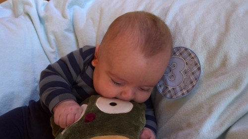 As far as his daily happenings, he can now smoothly reach to grab things and put them in his mouth. When he talks, he actually sounds like he’s telling a story- the inflection is there. He has a decent sleep routine- about 8hrs alone at night and another 2 or so on the couch with me, then 2 naps during the day. We’re practicing napping in the crib- he doesn’t sleep as deeply but isn’t concerned at all about being left in there. Good enough for me.