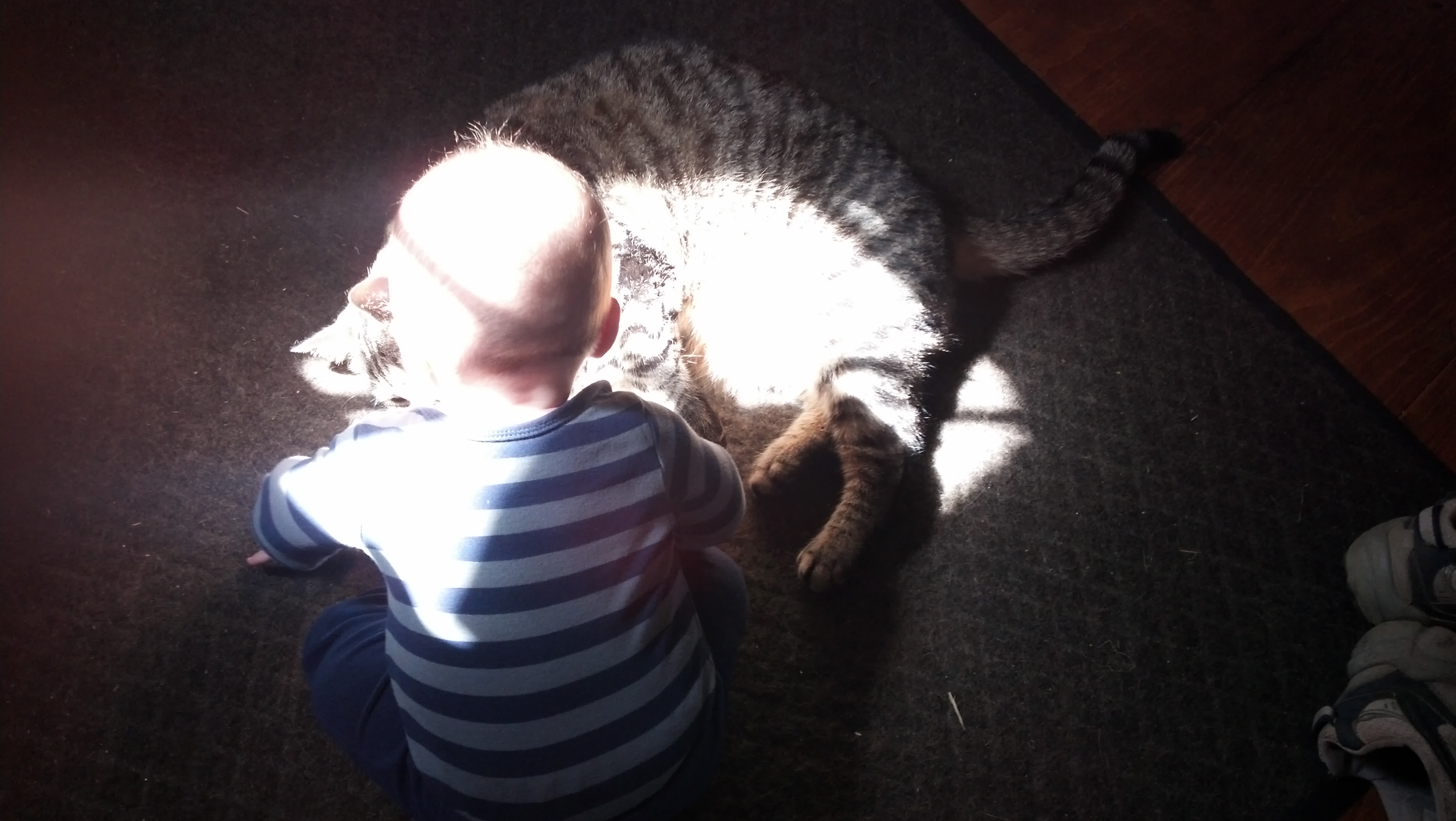Sitting up on his own to hang out with Darwin. Those two are going to be buddies. And no, he can’t actually sit up yet- If he’s not too squirmy we can sit him up and his buddha belly kind of props him there. Ha!