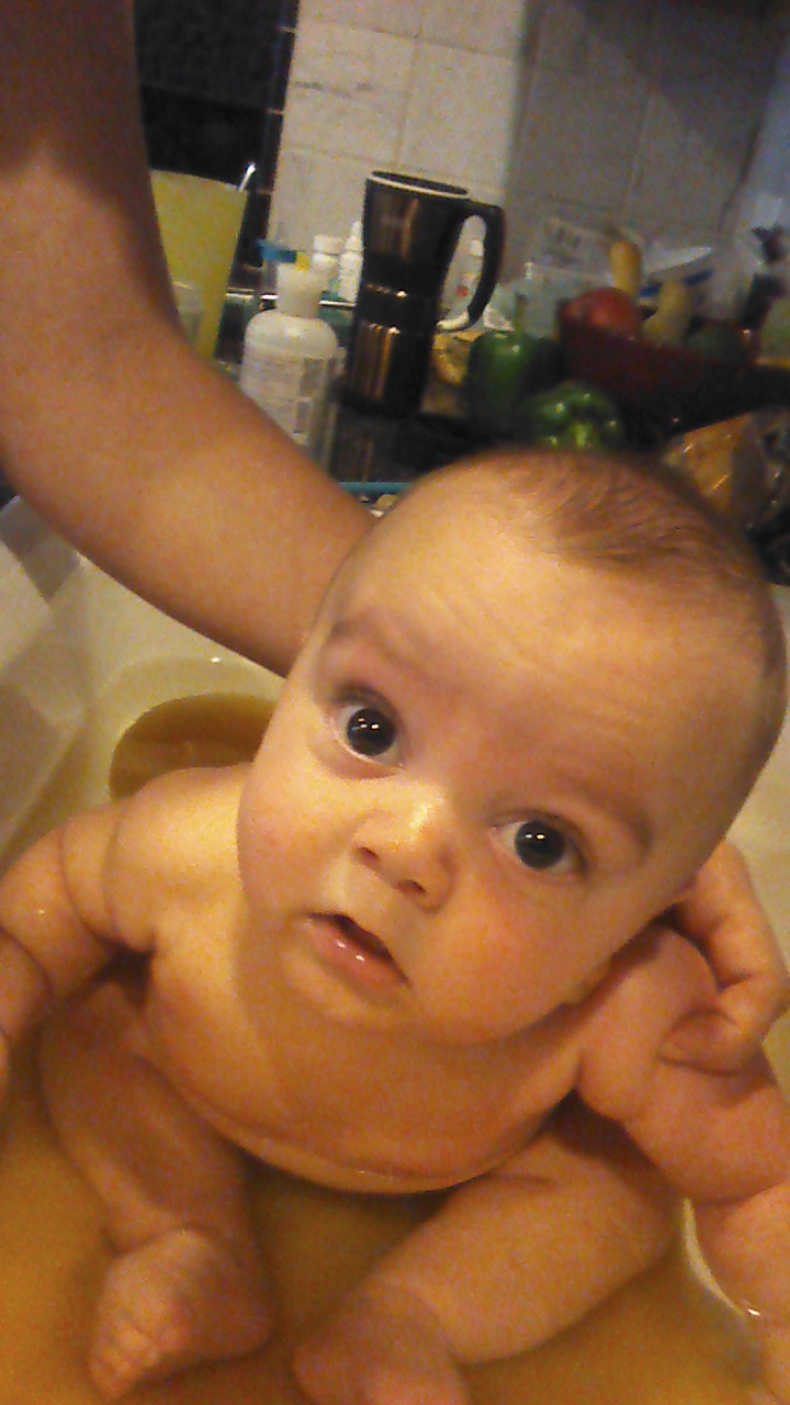 This next one is just him on Evelyn’s activity mat (she’s two months older and has moved on to the bouncy chair!). He’s never acknowledged his feet until today. Now he’s watching them, grabbing his legs, and using his feet to mess with the toys. Pretty cool stuff!