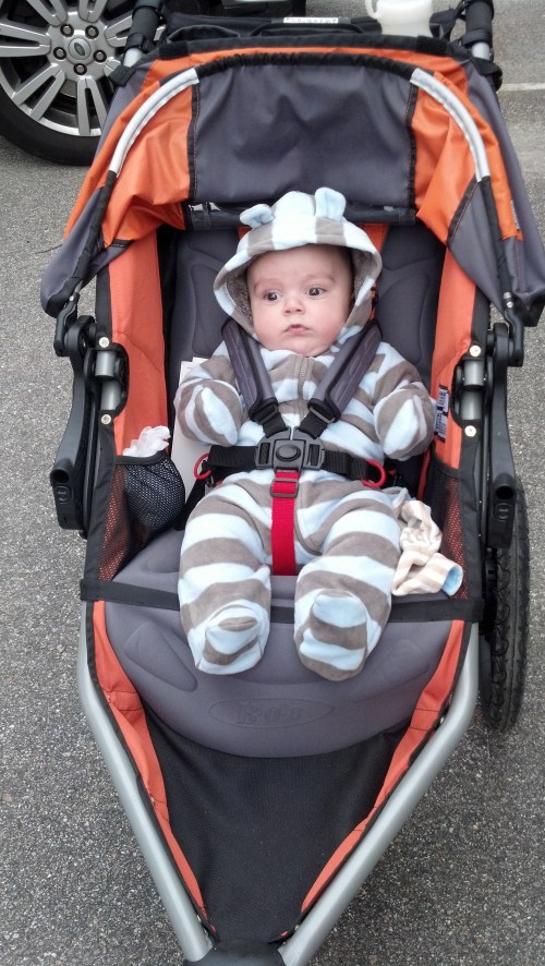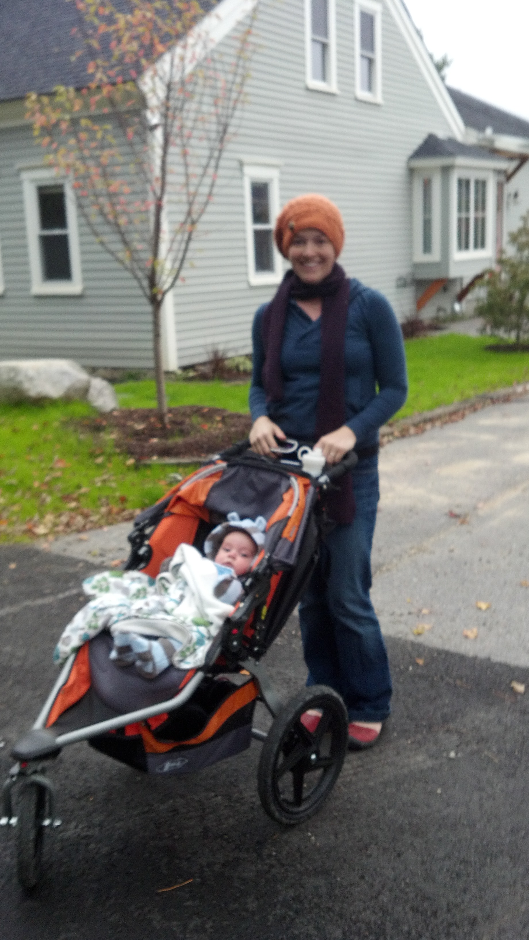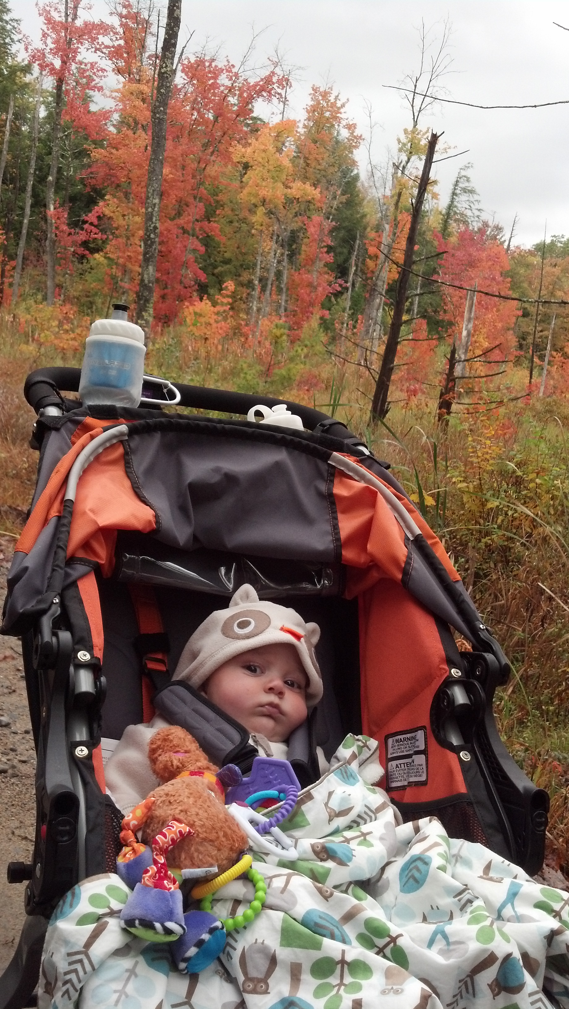 The weekend was cloudy, cool, and drizzly- Luke did some works outside and I brought Grey around to hang out with dad. We took him on his first walk in the jogging stroller without the carseat insert. This means he gets to sit facing forward and see what’s going on: