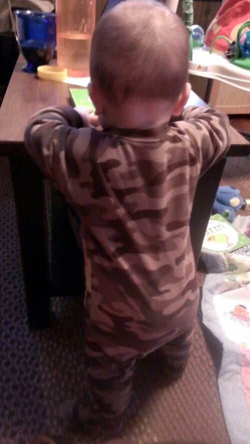 He obviously didn’t pull himself up, but he’s getting mighty comfortable with standing and holding on to something. It’s going too fast.