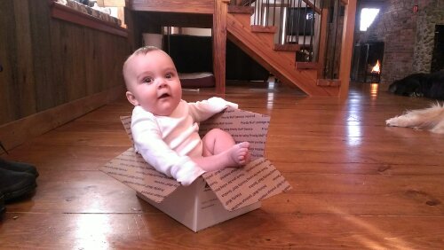 He also scootches to the coffee table and pulls the toy box out like it’s his job. He also peeks through the legs of the table and laughs hysterically when we catch him watching us. He sits up with no problems at all, leaning in all directions, completely comfortable with his ability to pull himself back. He’s starting to lunge forward from sitting in an early attempt to crawl. It inevitably ends in a face plant, but now he doesn’t cry.